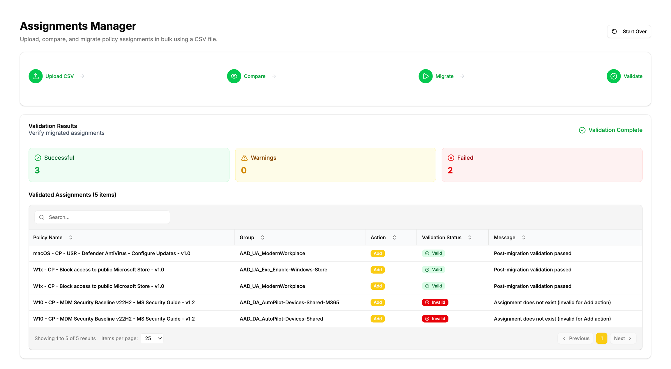 Continuous compliance monitoring Validate assignments against your desired state CSV and catch configuration drift before it impacts users.