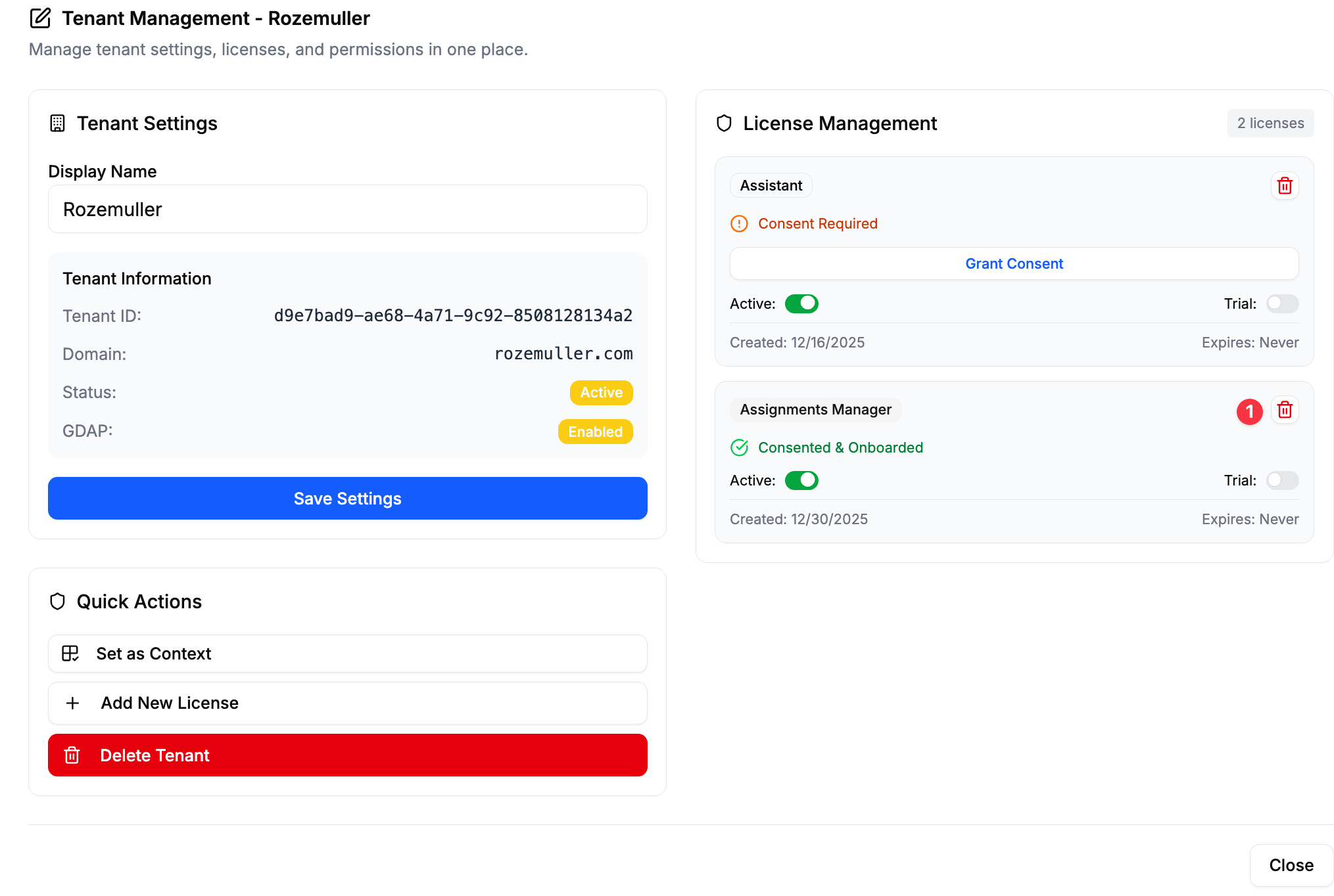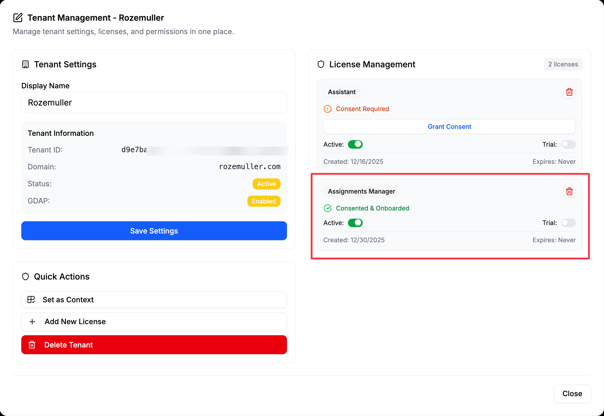 License management allows MSPs to control which features and capabilities are available for each customer tenant. When you add a license, additional permissions may be required through a consent process to ensure proper functionality.