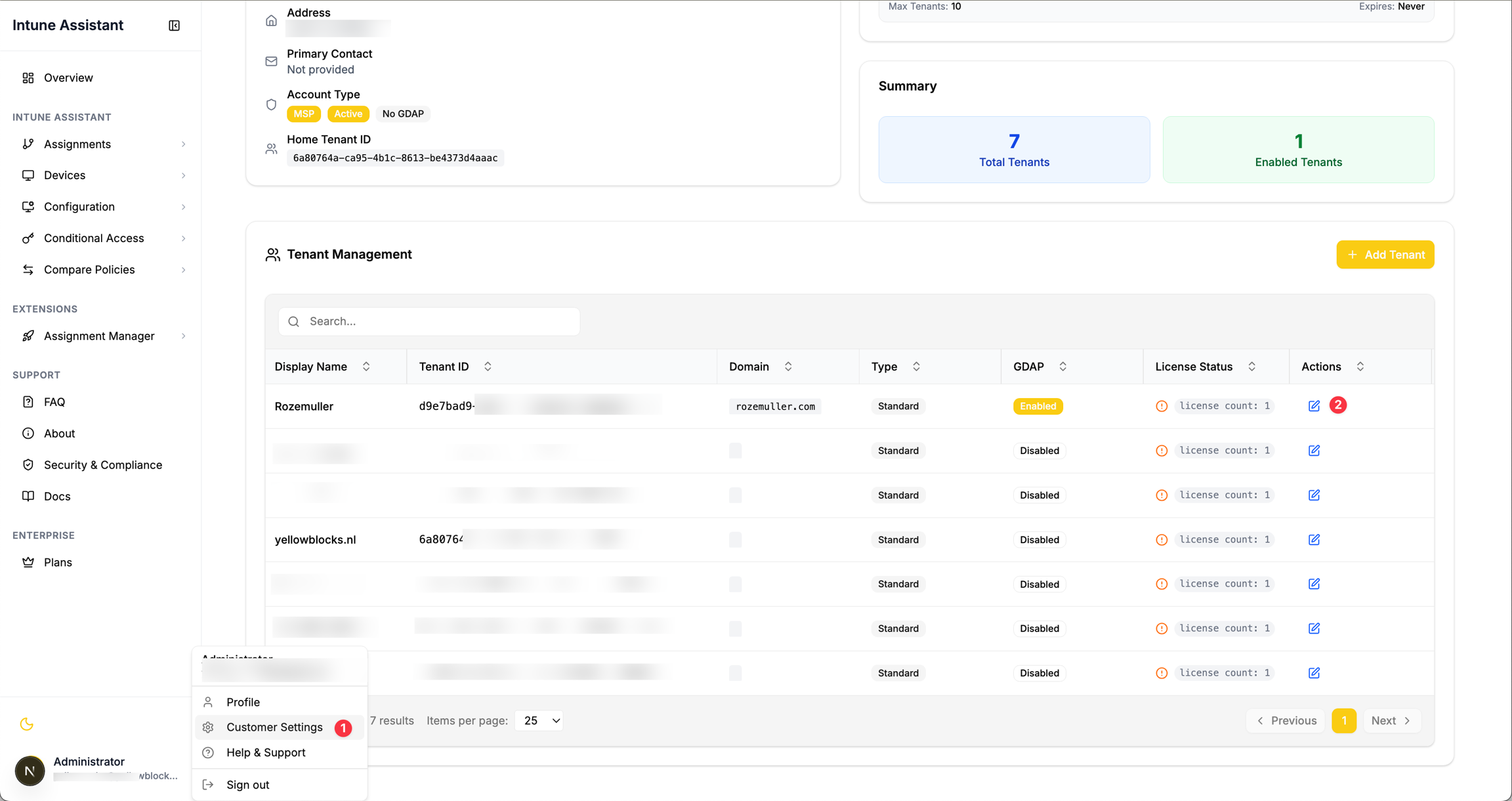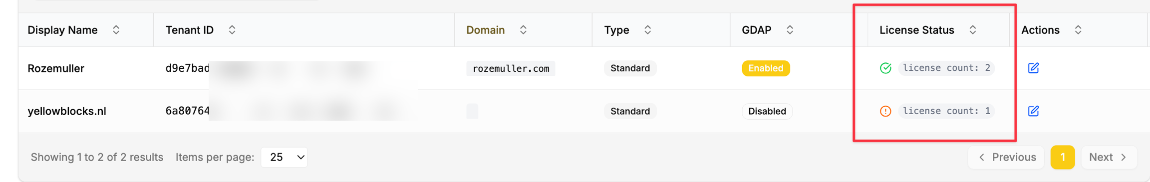 In the tenants list, license status is indicated with icons: