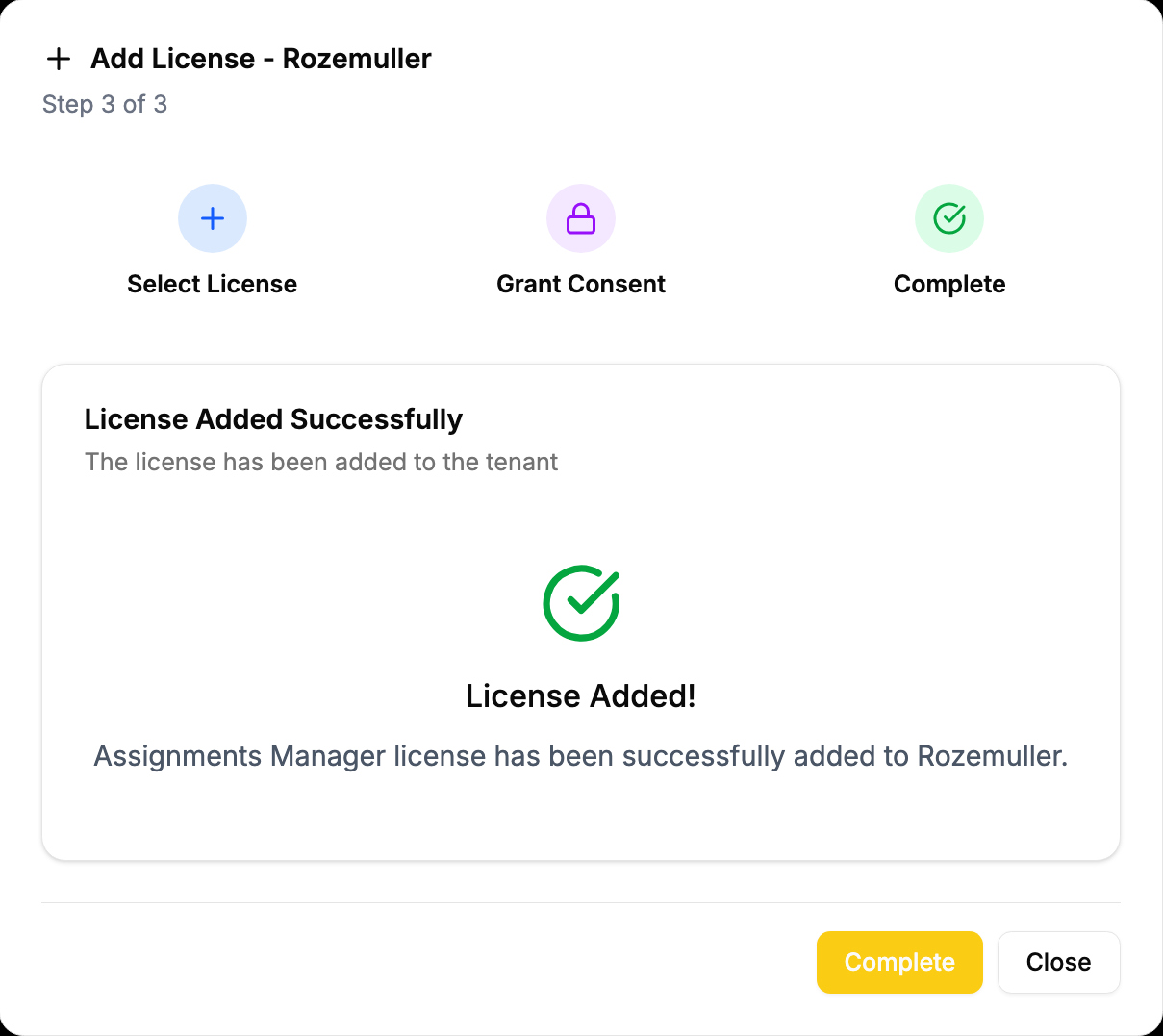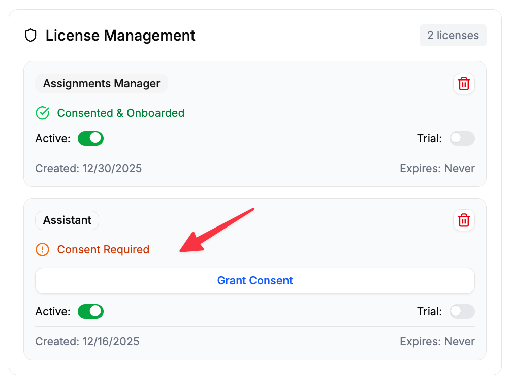 When adding a license, a consent process may be triggered to request the correct permissions needed for the new license features.